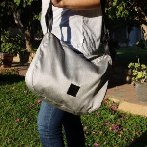 תיק מסנג'ר מבד אפור כסוף עם רצועת עור מעוצב בקו מעוגל. נוח, פרקטי ובגודל המושלם עשוי מבד מיוחד בצבע אפור כסוף