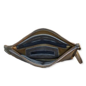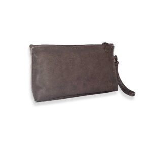 ארנק מעור עם סגירת רוכסן, בצבע אפור. ארנק נוח מאוד, וסופר פונקציונלי. בפתיחת הארנק רואים את כל התוכן ולא צריך להפוך ולחפש.. עשוי מעור מיוחד עבה רך עם מראה טבעי במראה משומש שמקבל אופי מיוחד עם השימוש. מצורפת ידית אחיזה לנשיאה כתיק קלאץ'.